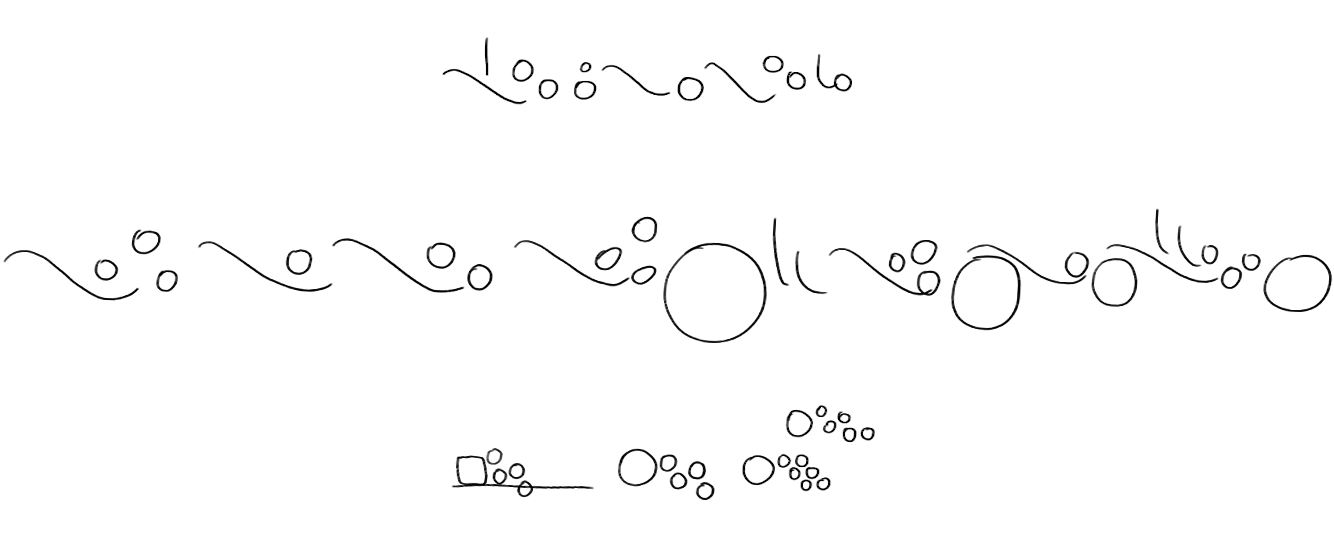 This is when I have the epiphany that there are four basic shapes I want to use ⟨\, |, 6, ◯⟩ and that I only want to use two of them to start every cluster with ⟨\, ◯⟩.