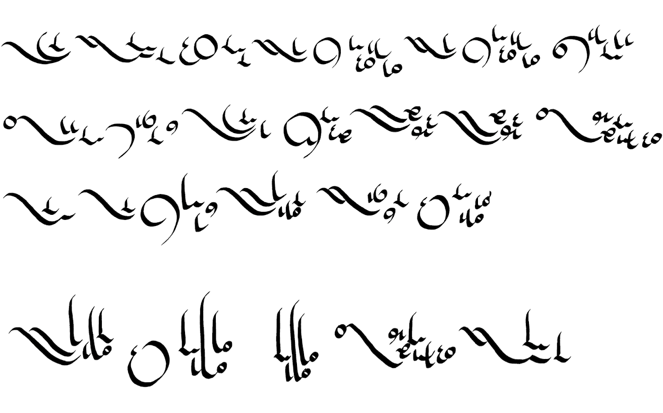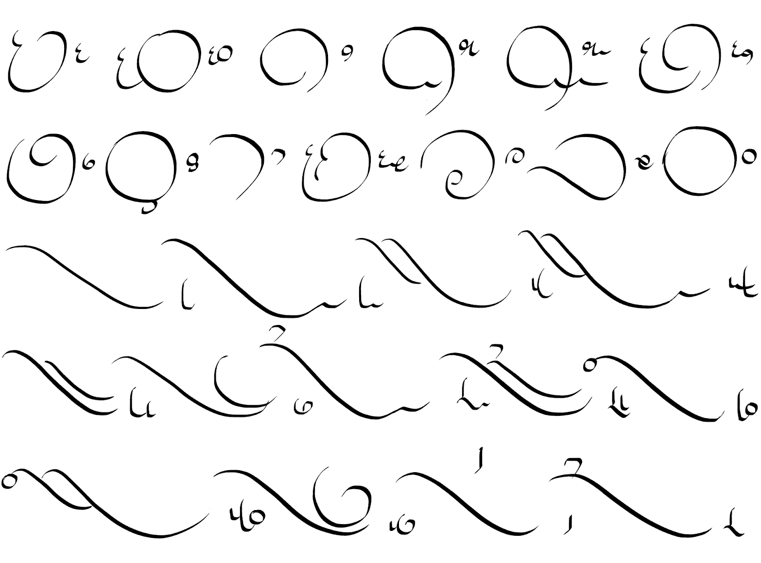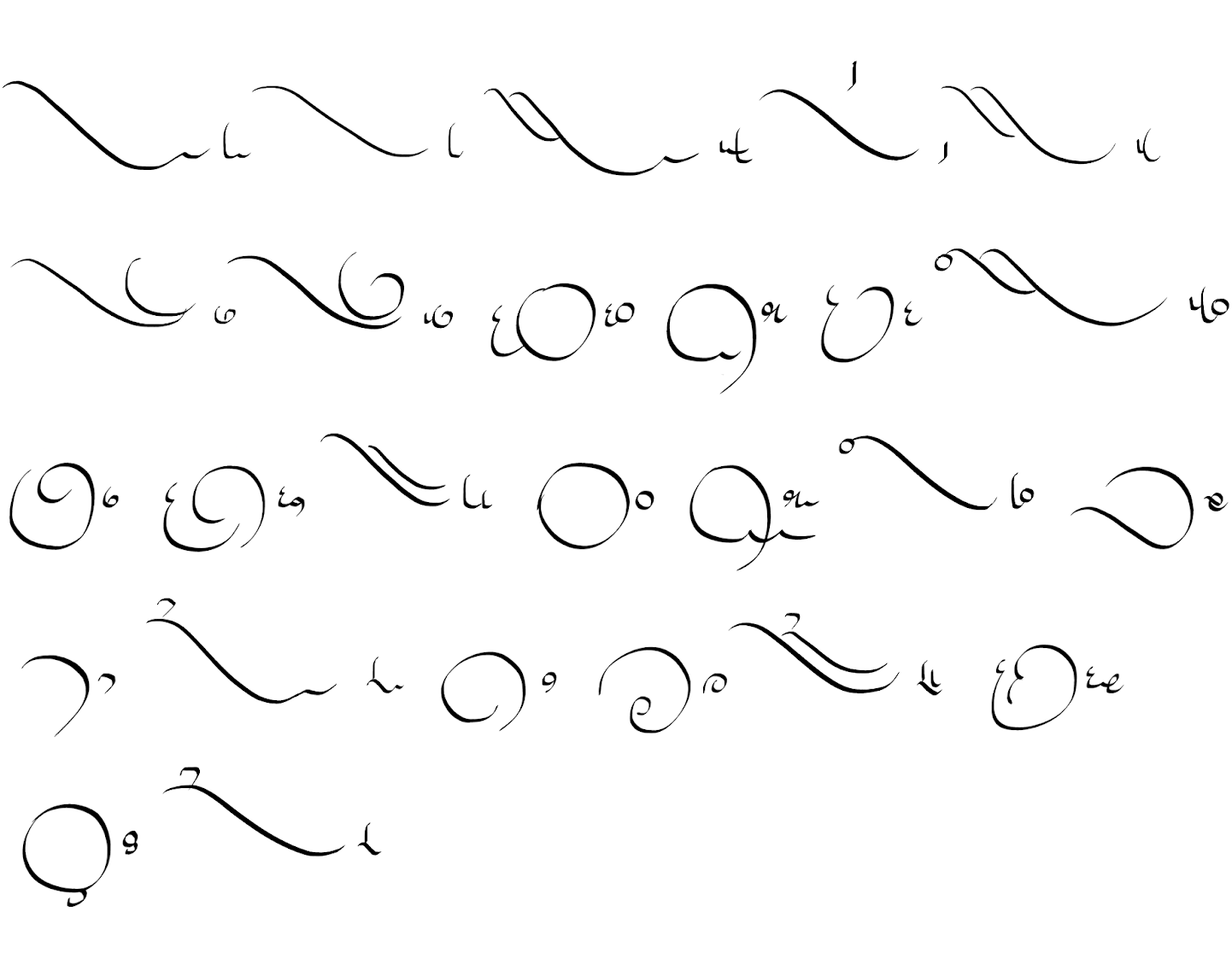 I design scripts regularly as one of my creative outlets. All I know about this one going into it is that I want something graceful and complex, and something that is beautiful to look at. That’s not an original design goal, either for me or in general, so I know that I will have to make my characters with interesting shapes to avoid recreating other scripts I’ve made. I design with traditional media, usually pens and brushes, and I am particularly fond of sweeping strokes so I hope to include lots of those. They’re very satisfying to draw and they can add nice dynamic motion to your work.