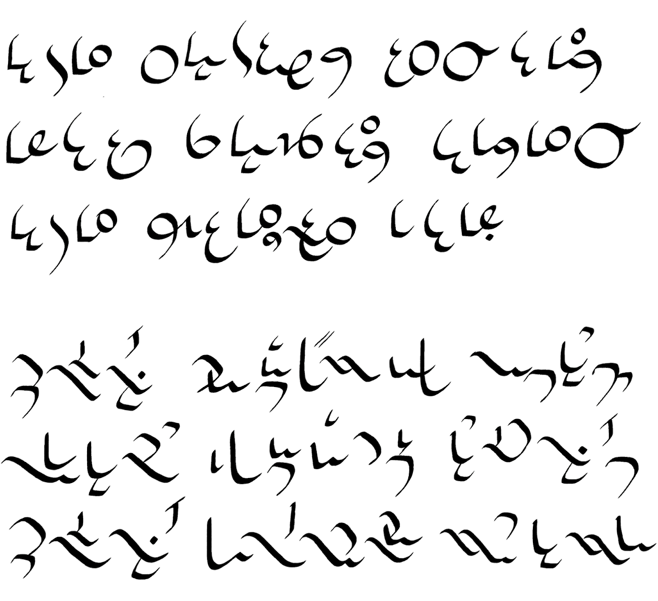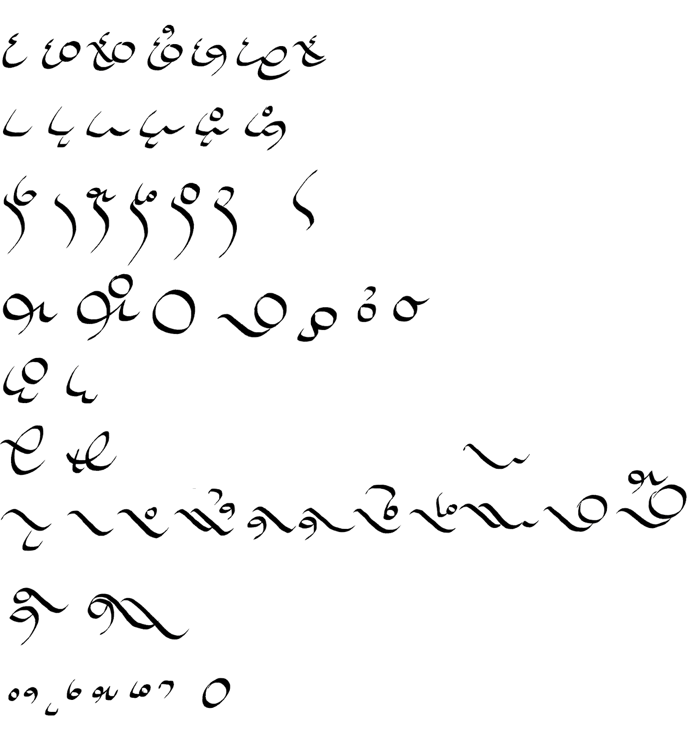 These are the two separated character sets, with a few characters added as I felt necessary. The lower one, the ‘angled characters’, seem to be developing modifiers that rest on top of the basic shape.